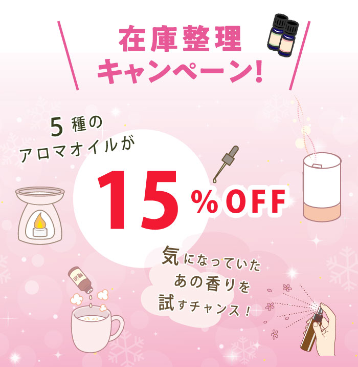 アロマオイルの限定企画も次号が最終回となりました。今回は一足先に対象のアロマオイルを在庫整理の割引価格でご提供いたします。