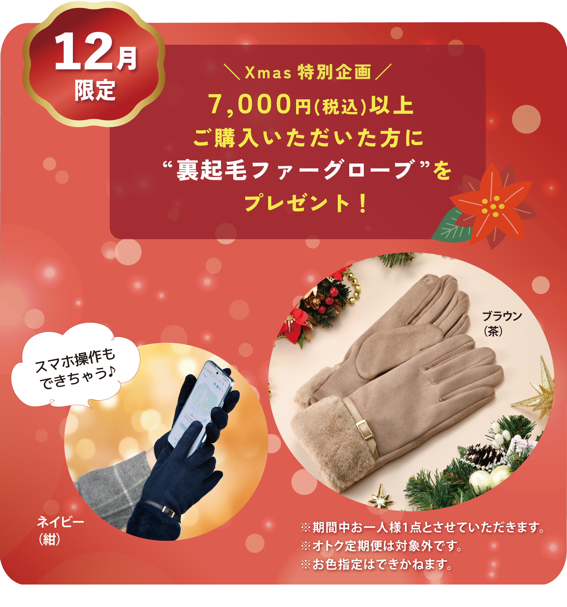 12月はXmas企画としてエレガントな”裏起毛ファーグローブ”をご用意しました。